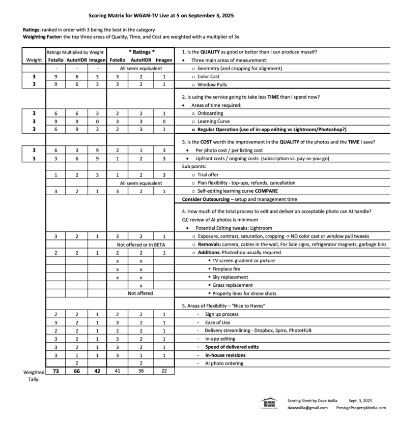 | Fotello is a We Get Around Network Marketing Partner --- WGAN-TV | Prestige Property Media's Dave Avilla on Fotello Versus AutoHDR Versus Imagen Versus His DIY | Guest: Prestige Property Media Founder Dave Avilla | Wednesday, 3 September 2025 | Episode: 264 ![]() www.WGAN.info/fotello WGAN-TV | Transcript: Fotello is the #1 AI Real Estate Photo Editing Service, says Dave Avilla ===================================================================== 1. 24 Sets of Example Images courtesy of Dave Avilla: AutoHDR | Fotello | Imagen | DIY 2. Scoring Matrix courtesy of Dave Avilla (pdf, .xlsx) ===================================================================== Hi All, [Transcript (below)] -- Do you edit your real estate photos your self? -- Do you outsource real estate photo editing? -- Do you use AI platforms for editing real estate photos such as: Imagen, AutoHDR or Fotello? Stay tuned ... On WGAN-TV Live at 5, at 5 pm ET on Wednesday, 3 September 2025, my guest will be: San Francisco Bay Area Prestige Property Media Founder Dave Avilla. Dave will share his hands-on experience comparing: Do-It-Yourself (Lightroom / Photoshop) Imagen AutoHDR Fotello AIDave will discuss how each option impacts: Image quality (color accuracy, sharpness, window pulls, sky replacement, verticals) Time savings and workflow efficiency Cost considerations for photographers at different volumes Where each solution excels — and where it falls shortWho should watch? Real estate photographers currently editing their own images Real estate photographers outsourcing editing to human editors Photographers outsourcing to Imagen, AutoHDR or Fotello Anyone curious about AI-driven photo editing for real estate listingsQuestions for Dave? What would you like me to ask Dave during this WGAN-TV Live at 5 show? By the way, Dave has been my guest on WGAN-TV Live at 5 multiple times. Dave is known for his deep-dive research to help real estate photographers succeed faster. Best, Dan WGAN-TV | Prestige Property Media's Dave Avilla on Fotello Versus AutoHDR Versus Imagen Versus His DIY | Guest: Prestige Property Media Founder Dave Avilla | Wednesday, 3 September 2025 | Episode: 264 ===================================================================== 1. 24 Sets of Example Images courtesy of Dave Avilla: AutoHDR | Fotello | Imagen | DIY 2. Scoring Matrix courtesy of Dave Avilla (pdf, .xlsx) ===================================================================== Transcript (Video above) - Do you edit your real estate photos yourself? - Do you outsource real estate photo editing? - For editing real estate photos, do you use AI platforms such as AutoHDR, Fotello, or Imagen? Stay tuned. Hi all. I'm Dan Smigrod, Founder of the [www.WeGetAroundNetworkForum.com] Today is Wednesday, September 3rd, 2025. You're watching WGAN-TV: a podcast for digital twin creators shaping the future of real estate today. We have an awesome show for you. [www.PrestigePropertyMedia.com] Dave Avilla on do-it-yourself image editing versus AI platforms: AutoHDR, Fotello and Imagen. Our subject matter expert is San Francisco Bay Area Prestige Property Media Founder Dave Avilla. Dave, thanks for being back on the show. - Glad to be here, Dan. - Dave, before we do a deep dive into today's topic, please tell us about [www.PrestigePropertyMedia.com] - Thanks. Prestige Property Media started a little over four years ago. I was working as a new real estate agent and began taking 360 tours with a Ricoh camera for my fellow agents, and I really fell in love with it. Somebody asked me, well, can you shoot photographs? And so I got a camera and then I got my drone license the next year and frankly, never looked back. I really enjoy doing media. So, my package includes the full digital suite, which is the photographs, the walkthrough video, the Zillow 360 tour with the floor plan that comes with that. And then I do some drone shots, stills, and also some video that goes with the walkthrough. And then I put that together on a property page, and I'm using right now [www.WGAN.info/SHOWANDTOUR] for that property page. So I'm in Northern California, about 30 miles south of the San Jose airport. And yeah, I go up about 35, 40 miles from Gilroy and down to Monterey. That's my territory. - And the kind of clients that you're shooting for? - Pardon me? - The kind of clients, are they typical real estate agents and brokers? - It's completely real estate, residential real estate, three, four-bedroom house, five-bedroom houses that are in the area. - And when it comes to delivering your photos, are you editing them? What is your present workflow? - So, good question. So just real quick, I started out with HDR, I was using Aurora's or Skylum's Aurora HDR to do the HDRs. And I was delivering products that people were satisfied with. But it kind of became a hobby and I really enjoy working with software, learning software. So I started to see there was more I could be doing and there wasn't enough training available on the Skylum products as much as Adobe. So I switched to Adobe a couple years ago and kind of became my hobby just trying to just improve, incorporate flash, do flambient, and if you do that, if you look at any of those videos, you know Nathan Cool's out there, Mike Burke is out there. I mean, there's people that have really good channels with information and I just was slurping that stuff up, enjoying learning tricks and things. And so, continuing to improve. Most recently- - Dave, just for clarification, that's Lightroom and Photoshop. - Photoshop. - Yeah. - Yeah. I think it's, the price just went up I think to either $15 or $19 a month, but it's the way to get it done. And there's some things you can learn there without having to go really deep that are very helpful. And so, most recently I've been focusing on improving my color cast in the photos and also the golden card or the golden ticket is the window pulls because where I live, there's some pretty big media companies t