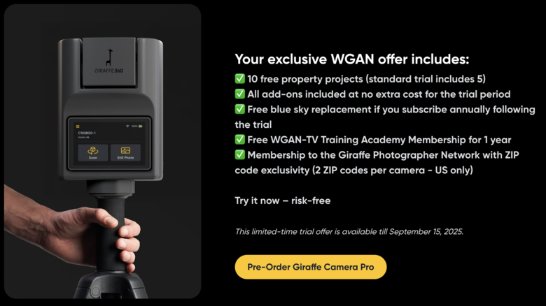 | Giraffe360 [ Coupon Code: WGAN ] is a We Get Around Network Marketing Partner --- Video: Today's Real Estate is Social Media or Die | Video courtesy of the Giraffe360 YouTube Channel | 11 am ET Tuesday, 30 September 2025 Giraffe PRO Camera Webinar (#5): Today's Real Estate is Social Media or Die Real estate photographers need to respond. Real estate has gone multi-channel. Portals are still critical, but social media, listing websites, and email marketing are now just as important to winning listings. Only 9% of agents are prepared to deliver on these promises. So here’s the question: are photographers a commodity, or a partner? Tuesday, September 30, 2025 11 - Noon (ET) Live on YouTubeJoin Giraffe360 CEO Mikus Opelts and Chief Customer Officer Samy Jeffries as they reveal: Buyer demand vs. agent reality vs. photographer role🧰 Listing Spotlight: turning captures into full marketing campaigns Giraffe PRO Camera update Live Q&ASource: Giraffe360 --- There’s still time to get in at the front of the line—but after Monday, 15 September 2025, this door closes and the next opportunity might not come with the same advantages. Giraffe PRO Camera Limited Trial Special Offer last day is Monday, 15 September 2025, unless extended by Giraffe360. Try Giraffe PRO Camera Risk-Free for 60 Days. Just $123 per month for two months with no long-term commitment. Scan up to 10 complete property listings. Includes all add ons. For full details and to order, visit: https://offer.giraffe360.com/wgan Giraffe360 expects to begin shipping Giraffe PRO Cameras in late September 2025.The first Giraffe PRO cameras will be dispatched in September 2025, according to Giraffe360 website. ![]() Giraffe PRO Camera Offer |