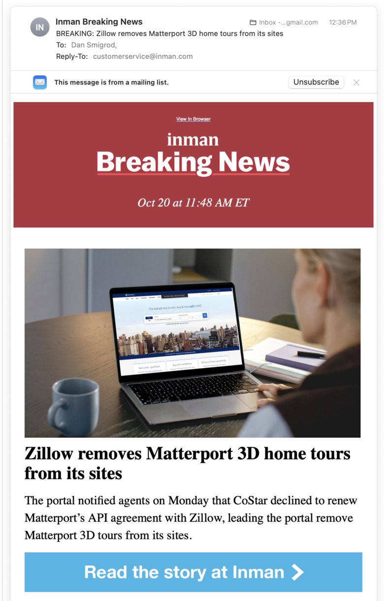 Hi All, List of media articles on this topic: ► Real Estate News (20 October 2025) Zillow pulls Matterport tours from listings, blames CoStar ► HousingWire (20 October 2025) Zillow pulls Matterport tours from its listings ► RisMedia (20 October 2025) Zillow Removes All Matterport Tours Amid Escalating Dispute With CoStar ► Inman (20 October 20250 Zillow removes Matterport 3D home tours from its sites ► WRE News (20 October 2025) CoStar’s Matterport 3D Home Tours Removed from Zillow’s Platforms Find more? Please post to this WGAN Forum discussion. Best, Dan P.S. Please see related WGAN Forum discussion: ► Changes to Matterport 3D tours on Zillow |
