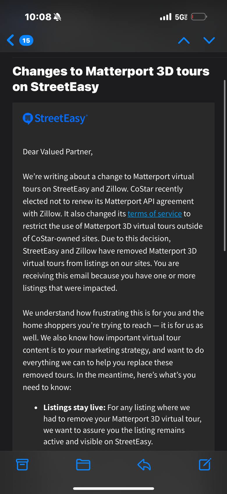 An email just came in from Matterport: Dear Valued Customer, We are writing to correct the intentional misrepresentations that you may have heard Zillow spreading regarding Matterport Spaces. Most importantly, as a Matterport customer, you can continue to share your Matterport Spaces anywhere, including Zillow. Neither Matterport’s nor CoStar Group’s media licensing terms have changed. If Zillow is removing Matterport Spaces from its website, that is a decision Zillow made unilaterally to the detriment of their customers. We recommend reaching out to Zillow directly. While media created by CoStar Group explicitly for use on our platforms is proprietary, Matterport customers can share their Spaces anywhere. We understand that Zillow has made reference to a terminated API agreement between Matterport and Zillow. That is a complete red herring, and unrelated to Matterport’s customers’ ability to share Spaces. Zillow knows this but chose to spread a falsehood anyway. The truth is that Zillow is desperately trying to divert attention from the slew of lawsuits it is now facing, brought by a brokerage, consumers, the FTC, State Attorneys General, and CoStar Group. Zillow is now playing games to stir up customer confusion and distract from its mounting legal troubles. In addition to diverting leads and banning listings, this is yet another example of Zillow harming agents and consumers. We regret that Zillow’s actions have caused you any inconvenience, and we look forward to continuing to work with you. Sincerely, Matterport Leadership Team |