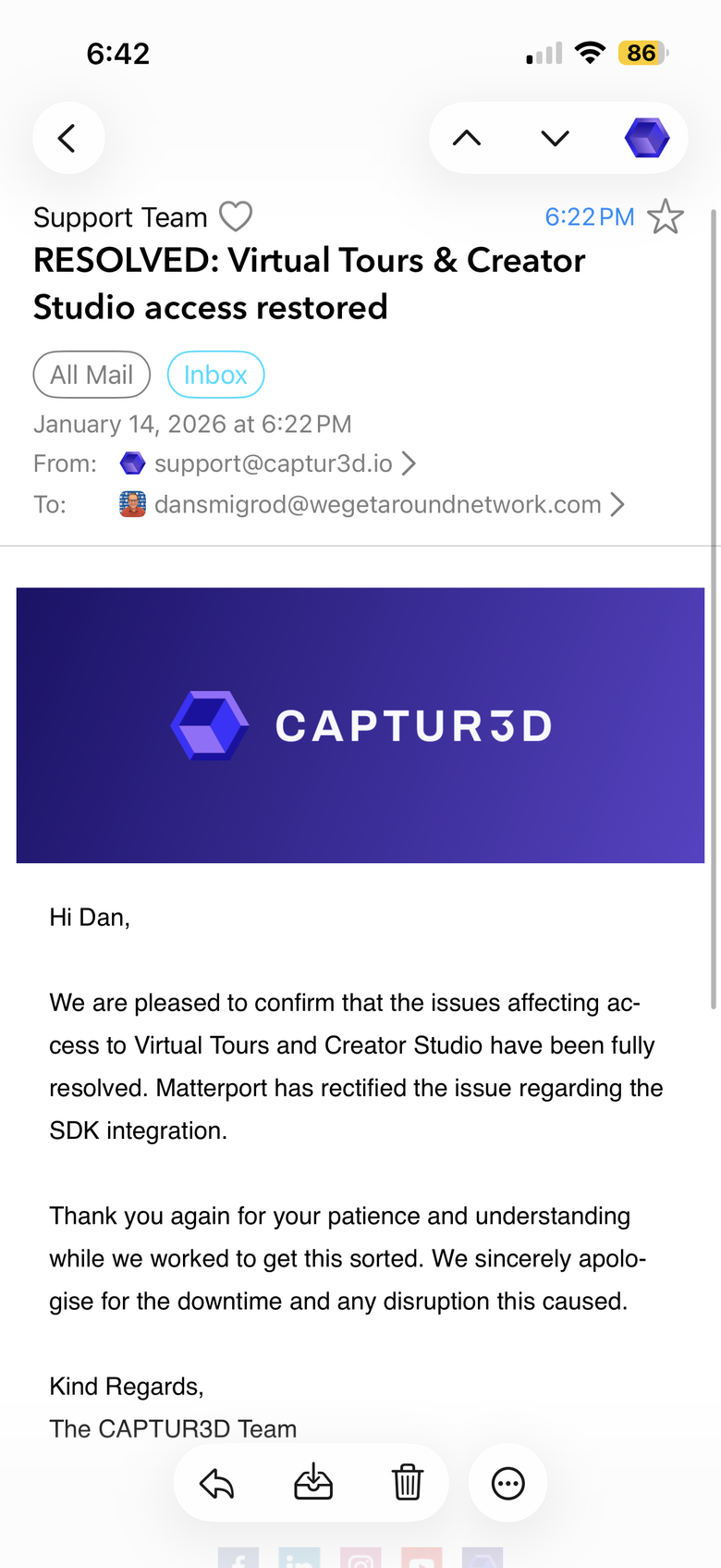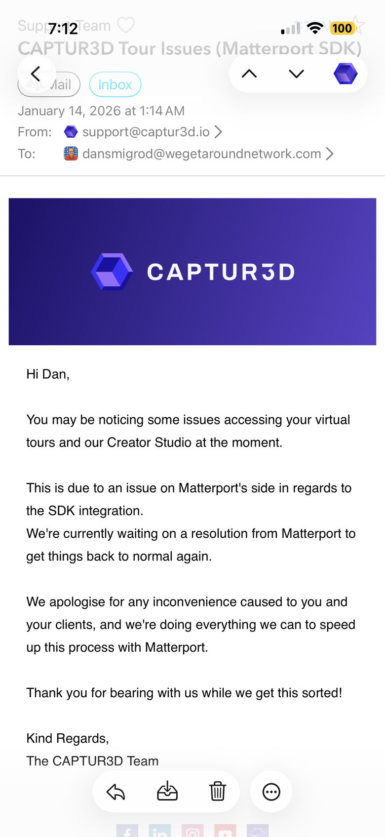 | I was just contacted by a client informing me that their Matterport tour (with a Captur3d overlay) is currently not functioning. When I logged in to my Captur3d account, this message was at the top of the dashboard: "Access to the CAPTUR3D Creator Studio and Virtual Tours is currently limited due to a Matterport system issue. Our team is working with them to restore full access as a top priority. Thank you for your patience." Anybody happen to have any further details regarding this issue? |