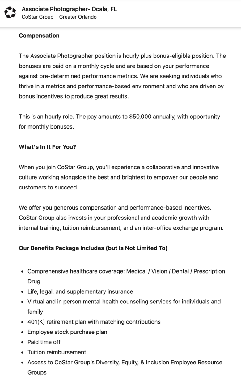 | Saw this pop across my Facebook feed this morning: Not sure if $26 an hour is good pay in Ocala, FL but, Fast Food establishments pay similarly in my market. One of the job Responsibilities: Own the market! While not working on a residential home, navigate one-mile square grids to ensure complete commercial real estate data coverage. Identify new inventory, missing availability, and commercial properties to be photographed. Job Posting ![]() |